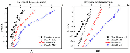 Comparison of the measured horizontal displacement data and the results calculated using different constitutive models: (a) phase 6; (b) phase 10.