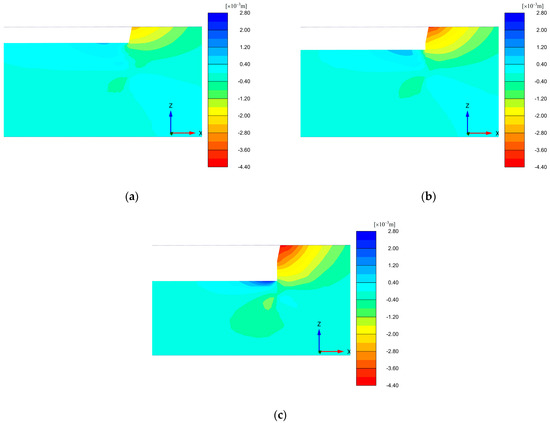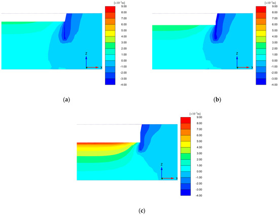 Nephograms showing vertical displacement of soil in typical sections of a foundation pit during different construction steps: (a) phase 4; (b) phase 6; (c) phase 10.