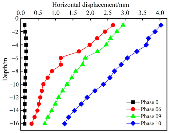 The deep-level horizontal displacement of the excavation support structure is shown in Figure 16. Significant variations in horizontal displacement are observed in the upper part of the support structure, while the lower part exhibits smaller changes. The horizontal displacement values decrease as the depth increases with the progress of the excavation construction. Before Phase 6, there was almost no significant deep-level horizontal displacement in the lower support structure. However, after the completion of Phase 6, the maximum deep-level horizontal displacement value occurred at the top of the pile, measuring 2.65 mm. This indicates that the row pile construction had a significant impact on the deep-level horizontal displacement. By Phase 9, the maximum deep-level horizontal displacement value increased to 2.94 mm, representing a growth of only 10.94% and indicating that a bolt can effectively control the deep horizontal displacement of the pile. Finally, after the excavation was completed (Phase 10), the maximum deep-level horizontal displacement value was 4.03 mm.