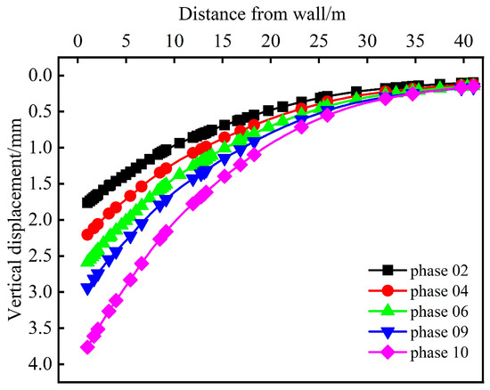 Figure 17 shows the vertical displacement curves for the soil behind the wall during different construction steps. The vertical displacement curves of the soil behind the wall are parabolic, and the closer to the supporting structure, the greater the displacement value. Upon reaching construction phases 2 and 4, the maximum vertical displacement values of 1.76 mm and 2.20 mm, respectively, were recorded for the soil behind the wall. This shows that in the construction stage of the upper soil nailing wall, the vertical displacement value of the soil behind the wall develops rapidly. This is due to the influence of the upper earthwork excavation on the shallow soil disturbance and the active earth pressure at the edge of the foundation pit. Upon completion of the soil nailing wall, maximum vertical displacement values of 2.59 mm and 2.94 mm were recorded for the soil behind the wall at the end of phases 6 and 9, respectively. This shows that the excavation of the lower soil has a relatively small influence on the vertical displacement of the soil behind the wall. In the final excavation stage (phase 10), the vertical displacement behind the wall increased slightly, indicating that as the excavation depth increases, the constraint of the supporting structure on the vertical displacement of the soil behind the wall begins to weaken.