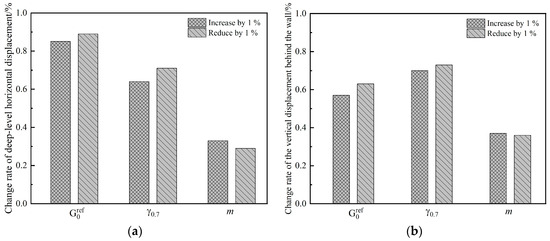 Figure 22 shows that the small strain parameters and had a great influence on the deformation of the foundation pit. Every 1% change in the small strain parameters caused the deformation of the foundation pit to change more than 0.6%. While the influence of on the deep-level horizontal displacement of the foundation pit was the most obvious, and the influence of on the vertical displacement of the soil behind the foundation pit wall was also obvious, and they were more sensitive to decreases in the parameter values than increases. The influence of the parameter m in the large strain range on the deformation of the foundation pit is obviously smaller than that of the small strain parameters. When the large strain parameter m changed by 1%, the deformation of the foundation pit was about 0.3%.