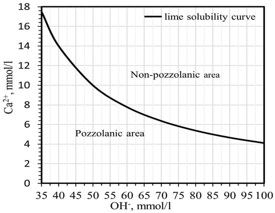 This test was first developed by N. Frattini and was later adopted by the EN 196-5 standard []. Using this standard procedure, it is possible to quantify the lime consumed during the pozzolanic reaction in an aqueous solution containing a sample at a temperature of 40 °C []. The pozzolanic reactivity can be measured by quantifying the number of calcium ions (Ca2+) in the aqueous solution in contact with the hydrated cement with time (e.g., 8 or 15 days) []. Figure 2 shows a diagram for assessing the pozzolanic activity provided in EN 169-5. Results that fall below the lime solubility curve show pozzolanic reactivity, as indicated by the removal of Ca2+ from the solution []. Decreasing the hydroxyl content results in increasing C–S–H and C–A–S–H nuclei []. The lime solubility curve represents the maximum Ca2+ concentration as a function of at 40 °C using Equation (4) [], where Ca2+, equivalent to CaO in mmol/l, is linked to in mmol/l [].