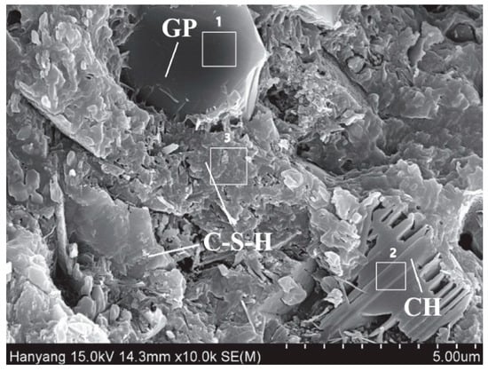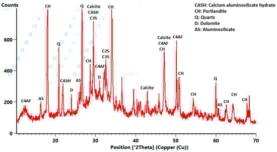 X-ray diffraction spectroscopy, or XRD, is a powerful technique for the quantification of crystalline and amorphous phases []. This technique can not only detect and characterize the main phases such as quartz, muscovite, albite, chlorite, and calcite in pozzolan powders [], but is also a direct method of quantifying consumption of Ca(OH)2 in hydrated samples []. Figure 4 demonstrates XRD peaks of the hydrated products, CH and C–A–S–H, for a hydrated cement sample partially replaced with brick powder.