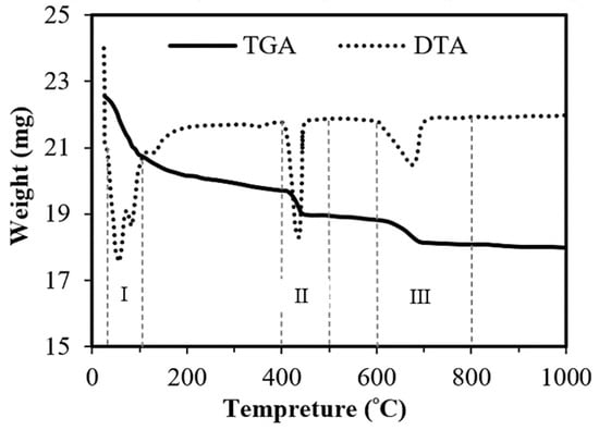Thermogravimetric (TG) and differential thermal analyses (DTA) have been widely used for the characterization of pozzolanic reactivity []. TG/DTA is one of the direct methods used to measure the amount of portlandite consumption [,,]. TG analysis (TGA) is an analytical method that records the relationship between mass and temperature (TGA curve) on a thermal balance []. A TGA test measures the change in mass of a sample as a function of temperature or heating time []. The tangent method is used to calculate the percent weight change or mass loss of calcium hydroxide in the samples []. An indicator of pozzolanic reactivity is the amount of consumed portlandite in the lime–pozzolan (or cement–pozzolan) pastes measured with TG/DTA []. Typically, the portlandite content increases with age in samples that consist of plain portland cement due to the formation of additional hydration products with time. In contrast, the amount of portlandite in pastes containing SCMs is less than in plain cement samples because of a combination of the dilution effect and pozzolanic reaction []. Therefore, by determining the consumption of portlandite, the extent of reactivity of SCMs in the cement pastes can be evaluated []. The four main weight loss ranges typically identified by the TGA curve are as follows (Figure 5):