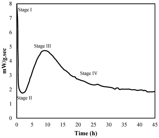 Typically, an isothermal calorimetry curve consists of four peaks and stages [] (Figure 6).