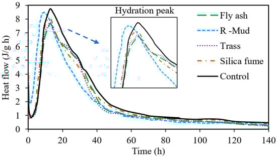 Several studies have assessed pozzolanic reactivity using calorimetry [,,,]. Bobrowicz and Chyliński [] compared the pozzolanic activity of R-Mud waste with other pozzolans, such as silica fume, fly ash, and trass, using an isothermal calorimeter. The calorimetry tests were conducted using 8 g of cement–pozzolan mixtures and 4 g of water inserted in syringes at 20 °C and monitored for a minimum of 140 h in customized measurement equipment. Each tested pozzolan replaced 15% of Type I portland cement. The R-Mud waste generated the highest heat after the control sample, demonstrating that R-Mud was a highly reactive pozzolan after 24 h of hydration. The higher specific surface area and very fine grains of colloidal silica present in R-Mud were mentioned as the main reasons for its high pozzolanic reactivity. In contrast, samples containing fly ash and trass showed the lowest heat of hydration compared to R-Mud and silica fume (Figure 7).