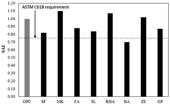 The SAI is a measure of the pozzolanic material’s impact, which is calculated using Equation (8) []: