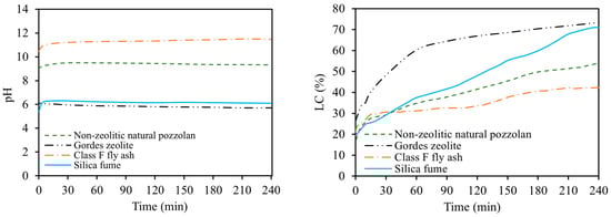 pH and LC (%) variation curves with time for pozzolan–water suspensions, adapted from Uzal et al. [].
