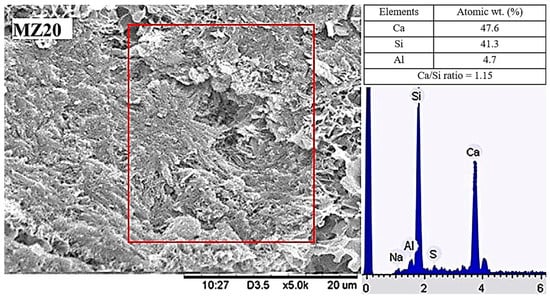In contrast to direct methods, indirect methods demonstrate the extent of pozzolanic reactivity by measuring the physical property of a test specimen [,,]. For instance, the strength activity index (SAI) is an indirect indication of the effect of pozzolanic reactivity on compressive strength. Calorimetry is another indirect method for assessing pozzolanic reactivity by measuring the heat of hydration in samples containing pozzolanic materials [,,,]. In addition, scanning electron microscopy- energy-dispersive X-ray spectroscopy (SEM/EDS) can be used as an indirect method to estimate the Ca/Si ratio of the C–S–H gel and identify a reactive pozzolan. The Ca/Si ratio of the C–S–H gel for the pozzolanic reaction is lower than the Ca/Si ratio of C–S–H from the hydration of cement [,,]. Electrical conductivity and pH are also other indirect methods for assessing pozzolanic reactivity. The pozzolanic reactivity can be assessed through measurement of changes in electrical conductivity and pH of a lime-pozzolan suspension in a certain time [,,,,,]. Ultrasonic pulse velocity (UPV) is another method that can be used to indirectly examine the interaction between portlandite and pozzolanic materials in concrete composites [] As a result of the pozzolanic reaction and the formation of C–S–H gel, the pores are filled and refined leading to an increase in UPV [,,]. Therefore, in a similar manner to SAI, the ultrasonic pulse velocity index (UPVI) can be used indirectly to assess pozzolanic reactivity [].