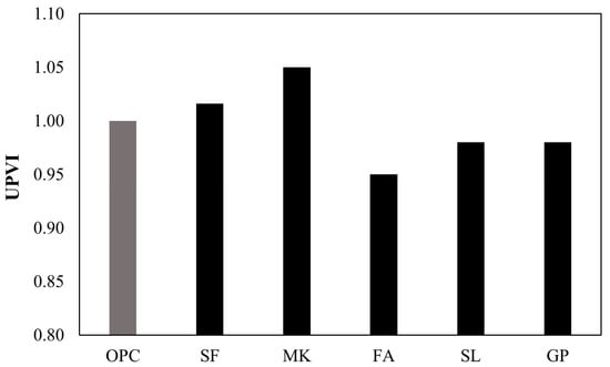 SAI results for different pozzolans; OPC (only portland cement), SF (silica fume), MK (metakaolin), FA (fly ash), SL (slag), RHA (rice husk ash), BA (bagasse ash), ZE (zeolite), GP (glass powder) [,,,,,].