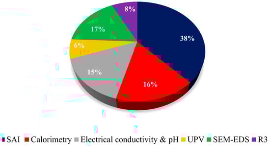 Luxán et al. [] first proposed an electrical conductivity method for assessing natural pozzolans, such as opaline rocks and volcanic tuff. Later, other researchers used these methods for the evaluation of the reactivity of artificial pozzolans, such as sewage sludge ash []. According to Luxán et al. [], a material’s pozzolanic reactivity can be determined based on the measurement of the electrical conductivity of a blended material with a lime-saturated solution at a minimum time (e.g., 2 min) (Table 3). The authors monitored the loss of electrical conductivity of 100 different pozzolans using 5 g of pozzolan in 200 mL of saturated calcium hydroxide at 40 ± 1 °C for 120 s [].