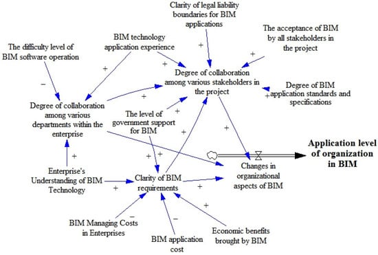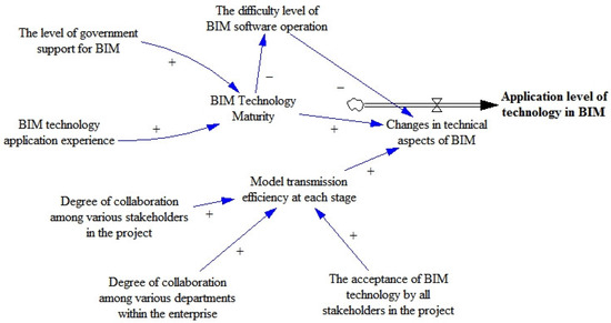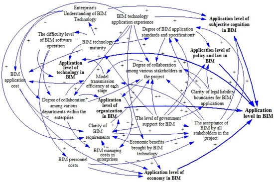 Based on research of the literature to identify the influencing factors of BIM technology application, expert interviews were used to determine the interaction relationship between the influencing factors of BIM technology application. The expert group consists of four university lecturers with more than 10 years of experience in BIM technology-related research. The voting method was used to determine the mechanism of action between each influencing factor. When three or more experts agree on a transmission, it can be determined that the transmission is valid. According to the results of expert interviews, Vensim (v7.3.5) software was used to draw a causal relationship diagram, as shown in Figure 1. The arrows represent the interaction between factors, and the positive and negative signs represent the promotion and inhibition of the interaction between factors. All factors are transmitted layer by layer to ultimately point to the application level of BIM technology.