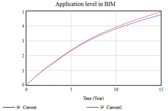By controlling variables, the initial value of a certain variable is changed by 0.3 on the original basis, while keeping other factors unchanged. The system dynamics model is run to observe the impact of different changes in factors on the application level of BIM technology. The results of the two simulations after the change and before the change are compared, as shown in Figure 19.