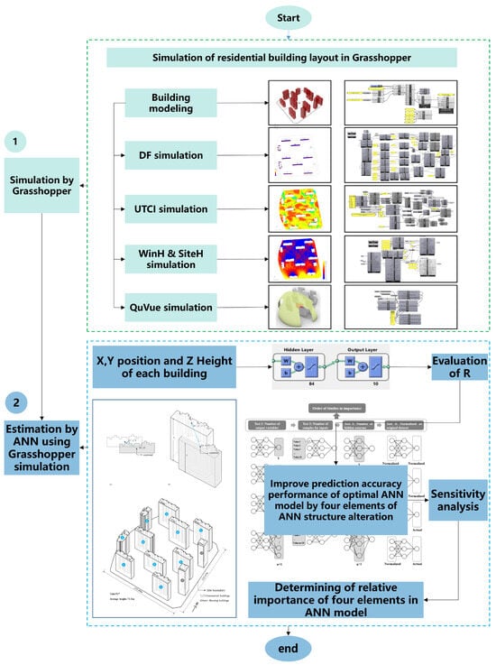 This study commenced by employing parameterized modeling of the building layout to identify the independent variables, variables, and constraints. The independent variable was limited to the building volume ratio or total building area. The next step involved parametric performance simulation, which included constructing lighting simulation models, site sunshine models, visual field models, and thermal environment models. This preparation was conducted to collect data for five performance analyses. In the training phase of the ANN model, three types of independent variables from the parameterized model were used as input data: the position coordinates, x-axis and y-axis coordinates of the building unit’s relative field, and its height, z. The output data consisted of calculation values from the simulation model, specifically the lighting coefficient, sunshine, vision, and outdoor thermal climate index. By conducting a four-part sensitivity analysis using the ANN architecture, improvements in prediction accuracy were achieved.