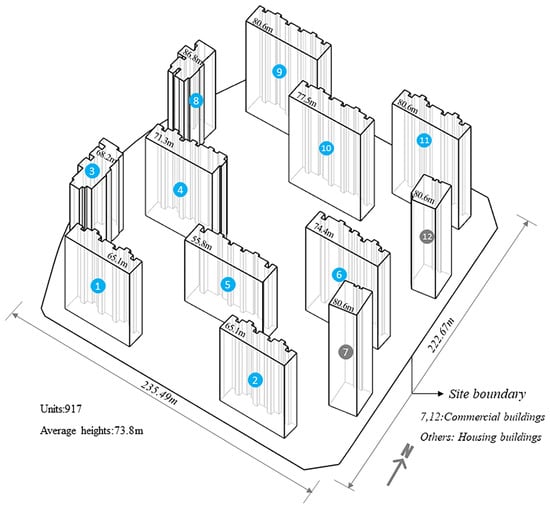 In the cold climate of Beijing, China, the test case involved twelve buildings situated on a site with a total area of 143,358 m2 (as shown in Figure 2). Among these buildings, ten residential buildings (No. 1–6 and No. 8–11) were included in the test, while two commercial buildings (No. 7 and No. 12) were excluded from the calculations (as depicted in Figure 2). It is worth noting that the test did not take into account the urban context surrounding the site due to its location in an open field.