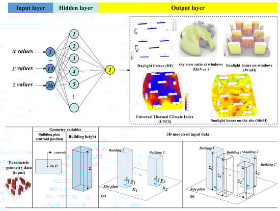 The following section discusses how the training dataset was obtained using different computational simulation tools in detail (Figure 3). In this study, considering the rectangular shape of the buildings, the methodology scope was bounded to residential buildings. The 12 test buildings’ spatial position variables (x_n, y_n, and z_n) meant that 36 variables were used (Table 1). The tests used default three-layer ANN models, which were made up of an input layer, a single hidden layer, and an output layer.