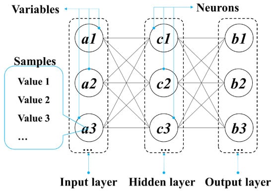 As shown in Figure 4, the variables of the input layers were represented as an and the output layer variables were represented as bn. Each variable contained the same number of sample sizes that had different values (Valuen). The hidden layer consisted of “n” numbers of neurons, represented as cn.