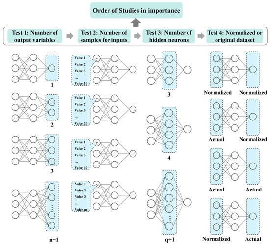 Figure 5 demonstrates the four tests discussed above. Test 1 showed a different number of output layer variables (bn). In test 2, the different numbers of sample sizes (Valuem) were tested to discover the difference between the number of samples and accuracy. For test 3, a q number of neurons was used for the hidden layer neurons (cq). In test 4, four ANN models of different input and output variables (normalized vs. normalized, actual vs. normalized, actual vs. actual, and normalized vs. actual) were constructed.