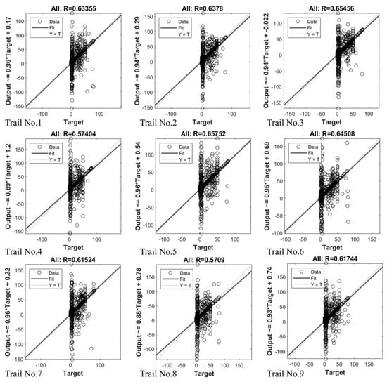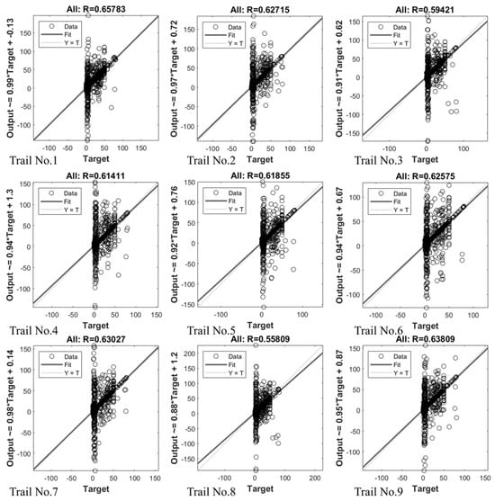 For training the ANN model, MATLAB’s Deep Learning Toolbox was used for the test. To find the overall performance in terms of accuracy, this study conducted 30 different trainings for each test, which allowed us to reach more stable correlation coefficients R. In the ANN calculating procedure, there were four R values for testing, training, validation and all data. In order to find network performance, the average of all the R data is applied in this paper. Basic ANN model setups were employed and revised to reflect the different configurations for different tests.