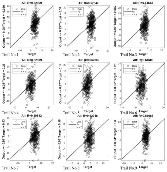 Figure 11 and Table 5 show the R value of the average of 30 trainings for all datasets, which considers the testing datasets and validation datasets. For model A, the R value for each of the five models was 0.226, 0.518, 0.623, 0.323, and 0.503. The average R value of all five ANN models was 0.438. For model B, the R value was 0.605 for group 1 and 0.507 for group 2. The average R value of the two ANN models was 0.556. Model C, which included all five output variables, had an R value of 0.621. The result was that model C made a better prediction than the other two models. Despite the fact that the absolute R value was typically low in most test scenarios, the patterns of variable transformation remained dependable. As a result, greater weight should be given to the relative R value.