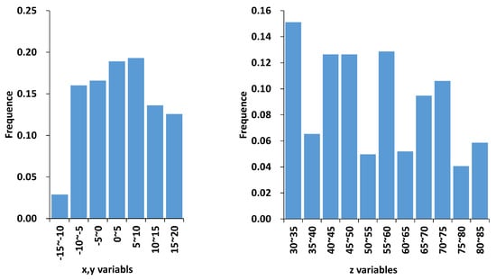 The frequency of distribution of x_n, y_n, and z_n variables was displayed in Figure 9. The frequency of the x_n and y_n variable values were between 0.1 and 0.2, except for the value range between −15 and −10 m (Figure 9, left). As can be seen in Figure 9 (right), the z_n variables were randomly grouped into two, one group in the 0.1–0.14 frequency range and another group in a frequency between 0.04 and 0.08.