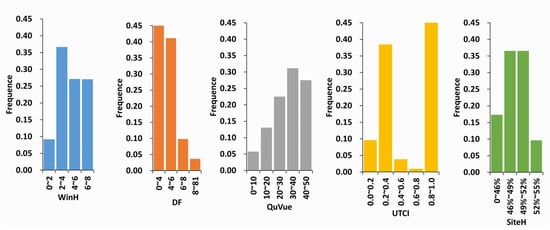 Figure 10 describes the ratio distribution achieved in the simulation results of five output metrics, which were WinH, DF, QuVue, UTCI, and SiteH. The highest frequency for the WinH simulation result ranged from 2 to 4 h. The simulation results between 0 and 2 h had the lowest frequency value, 0.10. For the DF simulation results, the maximum frequency was 0.45 when the DF value was between 0 and 4%. The lowest frequency was when the DF value was between 4 and 6%. For QuVue, the number of frequencies increased considerably from 0.05 to 0.30 when the QuVue result values were between 0 and 40%. The range of QuVue results from 40% to 50% had about the same frequency ratio as the range from 30% to 40%. The range of UTCI result values was from 0.8 to 1.0, in which the highest frequency was recorded at 0.45. Then, the frequency from 0.2 to 0.4 in UTCI ranked second, at 0.4. The frequencies of 46–49% and 49–52% in SiteH simulation outcomes were similar, exactly 0.35 for each, while in 0–46% and 52–55%, the numbers were considerably lower, averaging between 0.1 and 0.15.