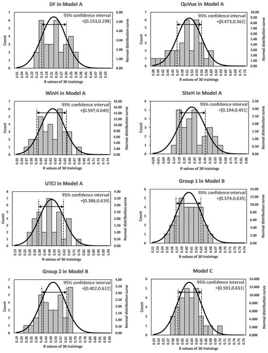 Each model conducted 30 trainings and the R values of the forecasting models were analyzed by R distribution analysis as shown in Figure 6, Figure 7 and Figure 8. From the R distribution histograms, the 95% confidence interval of the error distributions is located in different ranges for models A, B and C. The average values (μ) and standard deviations (σ) are listed in each histogram. All of the standard deviation values are smaller than 0.12, meaning a low degree of dispersion, and the average R can be used to express the average accuracy performance of each model.