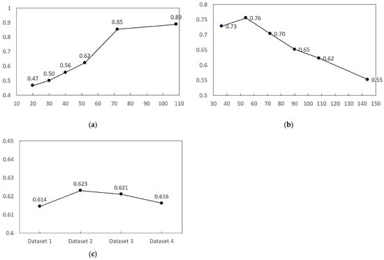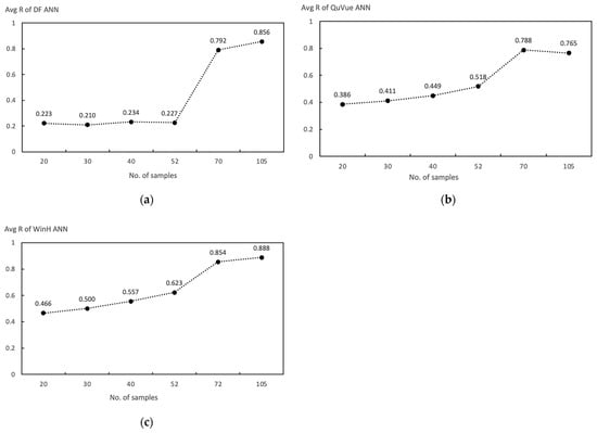 The number of input samples used for the test were 20, 30, 40, 52, 72, and 108. Based on the input variables (36), as a reference, a sample size 2 to 3 times the number of variables was recommended for the test, which was around 90 samples. Each test applied 30 independent trainings to find the R values. As shown in Table A1, Table A2 and Table A3, 30 trials were conducted to reach a stable accuracy of the R value.