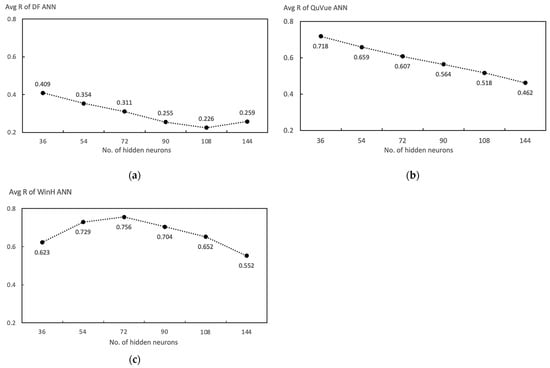 The number of hidden layer neurons depends on the ANN model’s complexity. A redundant number of neurons in hidden layers will lead to overfitting the ANN model and take more time for training. The numbers of hidden layer neurons used for the test were 36, 54, 72, 90, 108, and 144, which were 1, 1.5, 2, 2.5, 3, and 4 times the number of input variables (36).