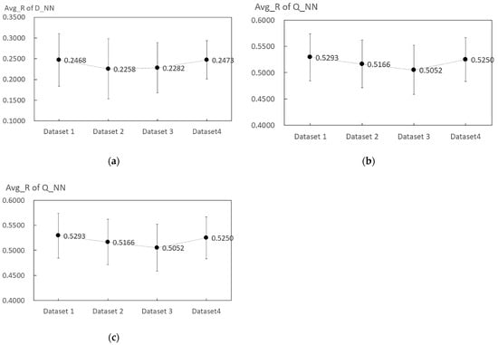These three models’ input and output training datasets were modified to have four different training datasets. Dataset 1 normalized both the input and output datasets, dataset 2 normalized the input but not the output, dataset 3 did not normalize the input but normalized the output, and dataset 4 did not normalize datasets for either the input or output. As in the previous three tests, training was conducted 30 times for all ANN models, and the average value was used to compare the different types of datasets.
