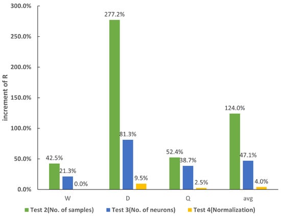 Test 4: normalized or original datasets. This test compared the combination of normalization and actual input and output values to decide which pair of groups achieve better accuracy. The normalization of variables was applied in a wide range of values, especially in different orders of magnitude. However, the difference in the ANN model accuracy of normalized or actual values revealed the significance of the normalization of the dataset. Upon reviewing the version of MATLAB utilized in our research, we found that the normalization step was not included in the procedure. For each test, the training process was repeated 30 times for all ANN models, and the average value was employed to facilitate comparison among different types of datasets for result validation purposes. This test aimed to discover the rules of the normalization of datasets to achieve optimal ANN models in terms of prediction accuracy ability.