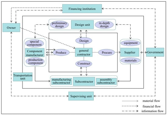 According to the dominance of different enterprises in the chain, it can be divided into a model led by development enterprises, a model led by general contracting enterprises, and a model led by prefabricated component factories [34]. The typical statements on the definition of the construction supply chain are as follows: (1) Starting from the needs of the owners and the material flow, financial flow, and information flow between participating enterprises, which are used for a series of processes such as project bidding, project approval, and acceptance, a functional and dynamic alliance is formed between different stakeholders [38]. (2) Led by a general contractor, the functional network chain comprises all participating enterprises due to their relationships in production and construction through the control of material flow, financial flow, and information flow. The form of the PBSC is not static.