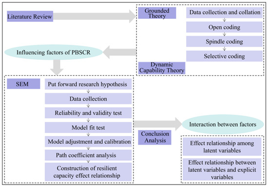 The improvement in PBSCR is a kind of supply chain capacity improvement. It refers to the ability to withstand disruptions during the normal operation of a supply chain due to small probability events, such as natural disasters, and the vulnerability of the supply chain structure itself. Simply put, it is the ability to recover quickly from disruptive events. It is an important research direction in the field of supply chain risk management. Most of the existing research studies have examined the SCR of the traditional manufacturing industry. Relatively few studies have studied PBSCR. The existing studies have mostly evaluated from the perspective of stage division. This study innovatively used the dynamic capability theory to study the improvement in PBSCR. The relationship between different factors was analyzed using SEM. The research process for this study is shown in Figure 2.