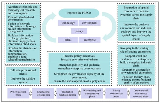 The risk awareness of personnel, the application level of information technology, the way the interests of supply chain stakeholders are distributed, the level of government support, and the regulatory ability of enterprises will affect PBSCR according to the analysis of the critical path. This is similar to the 4M1E theory [55,56]. “4M1E” refers to man, machine, material, method, and environment. Zhang, W., Deng, F. and et al. expanded the meaning of the 4M1E theory. They proposed that “Man” means “human resources”, “Machine” stands for “infrastructure”, “Material” is the meaning of “material resources”, and “Method” stands for “rules and regulations” [57]. Mao, Y. and Tuo, X. suggested that if material quality could not meet the standards, engineering quality would not meet the requirement [58]. Sun R., Zhao, S., You, J. et al. regarded material as the application of technology in the process of cleaning the egg industry chain. The method was considered to be the rules and regulations to be observed during production. The environment was considered to be the environment for the development of the industrial chain [59]. Similarly, if various technologies are not innovative, resulting in incorrect information and other problems in the PBSC, this also greatly increases the instability of the supply chain. These are the same as what the critical path covers. Based on the research results and the analysis of this study, suggestions for improving the PBSCR are shown in Figure 6.