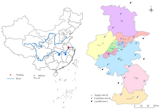 In this paper, Nanjing is selected to test the model. Nanjing is the core city of the Yangtze River Delta economic zone in China, with 11 districts and a large population (9,343,400 inhabitants at the end of 2022). The urbanization rate has increased by nearly 10% in the last 10 years, and the rate of urban expansion has increased, which results in a large amount of construction waste. According to the Nanjing Municipal Construction Committee, in 2021, Nanjing received 2.08 million tons of construction waste and release 1.95 million tons with a reutilization rate of 94%. In 2022, the Ministry of Ecology and Environment of China issued the “Work Plan for the Construction of Waste-free Cities in the 14th Five-Year Plan Period”, and Nanjing was included in the list of Waste-free Cities in the 14th Five-Year Plan Period. How to improve the level of reutilization of construction waste is an urgent issue for Nanjing’s urban construction waste management. At present, there are 19 candidate sites for treatment plants in Nanjing (all sites are taken from the 14th Five-Year Plan for Harmless Treatment of Domestic Waste in Nanjing) and 5 landfill sites (all sites are outside Nanjing and selected by government). To facilitate the calculation, the center of each district is assumed to be the supply site, and Figure 1 shows the locations of the supply sites, treatment plant candidate sites, and landfill sites.
