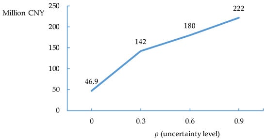 This paper compares the total cost based on the results of the objective function values. The objective function values of the total cost for different uncertainty levels of the supply quantity q were obtained using MATLAB. Figure 2 shows the total cost of construction waste recycling. When ρ = 0, the generated quantity of construction waste is fixed, and the total cost of construction waste treatment is fixed at this time. When ρ ≠ 0, the model changes from deterministic to uncertain, and the objective function value rapidly increases.