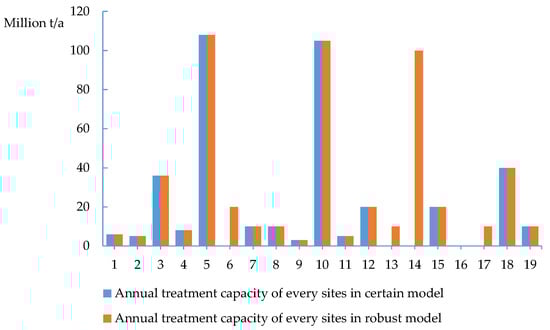 This paper compares the treatment capacity based on the treatment quantity of each treatment plant and the total treatment quantity. Figure 3 compares the total treatment capacity of the models based on the results of treatment plant selection output from MATLAB. The top horizontal coordinate is the total annual treatment capacity of the two models, and the sum of the annual treatment capacity of each selected site is the total annual treatment capacity of the models.