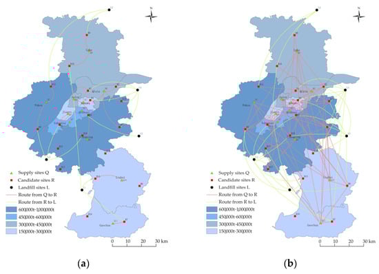 The data in Table 3 and Table 4 were processed by ArcGIS 22.0 and plotted against four levels of uncertainty in the supply of construction waste to obtain the changes in location of treatment plants and allocation of transport paths, as shown in Figure 4.