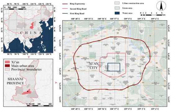 Xi’an city, located in the central–northwestern region of China (Figure 1), emerges as a formidable historical and cultural entity, in addition to its substantial economic significance. It is noteworthy not only for being one of the most ancient continuously inhabited cities globally but also for its historical role as the capital of various Chinese dynasties, such as the Western Zhou, Qin, Han, and Tang. These legacies have indelibly imprinted themselves upon its urban and architectural landscape, enriching its historical tapestry.
