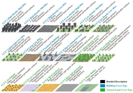 LCZs are categorized into two primary classes: built-up coverage and natural land cover. Under this framework, built-up areas are further subcategorized into 10 distinct types, while natural land covers are delineated into 7 types, resulting in a total of 17 LCZs, as exemplified in Figure 3 [2].