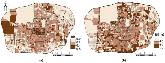 Spatial Grading Map of Building Density and Building Height (General Building Cover Types) (a) Local Climate Zone (Building Density) Spatial Grading Map; (b) Local Climate Zone (Building Height) Spatial Grading Map.
