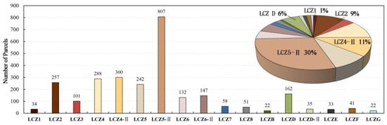 Xi’an exhibits notable spatial variations in its LCZs. Generally, the central city area is characterized by a preponderance of built-up coverage, while the peripheral zones predominantly feature natural land covers. The LCZ 5-II (medium-density mid-rise) category emerges as the most pervasive spatial typology within Xi’an’s main urban area, encompassing approximately 30% of the total land parcels (Figure 6). It is primarily situated between the first and second ring roads, extending beyond the second ring road, and is notably concentrated in older residential neighborhoods and substantial educational institutions. Following closely, the LCZ 4-II (medium-density high-rise) classification constitutes the second most prevalent type, accounting for 11% of the total land parcels. These areas are primarily located between the second and third ring roads and are frequently observed in high-rise residential sectors and high-rise office districts, mirroring a prominent urban development trend within Xi’an in recent years.