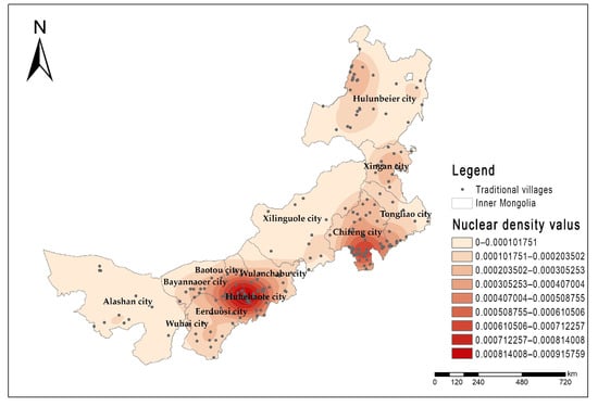The nuclear density analysis map of traditional villages in Inner Mongolia.