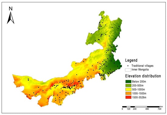 Natural geography is an important factor affecting the distribution of traditional villages, and the influence of topography is the most obvious. There are some differences in sunshine, temperature, and precipitation in different terrains, which affect the means of production and lifestyle in the region and thus affect the distribution of villages [44]. The whole region of Inner Mongolia is a plateau-type landform area with an average elevation of more than 1000 m, which is the second largest plateau among the four major plateaus in China. It has a variety of complex landforms with plateaus as the main body, including mountains, hills, plains, deserts, and other types. The Greater Khingan Mountains, Yinshan Mountains, and Helan Mountains, the ‘three mountains’ obliquely across the whole region, divide Inner Mongolia into north and south parts, which become the boundaries of the natural environment differences in the whole region. Its north is the narrow sense of the Inner Mongolia Plateau; from east to west in turn are the Hulunbeier Plateau, Xilinguole Plateau, Bayannaoer-Alashan Plateau; the south includes the Greater Khingan Mountains to the east of the Nenjiang West Bank Plain, West Liaohe Plain, Tumed Plain, Hetao Plain, and the Eerduosi Plateau in the southwest.