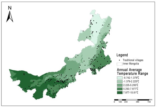 The correlation map between the distribution of traditional villages and the annual average temperature in Inner Mongolia.