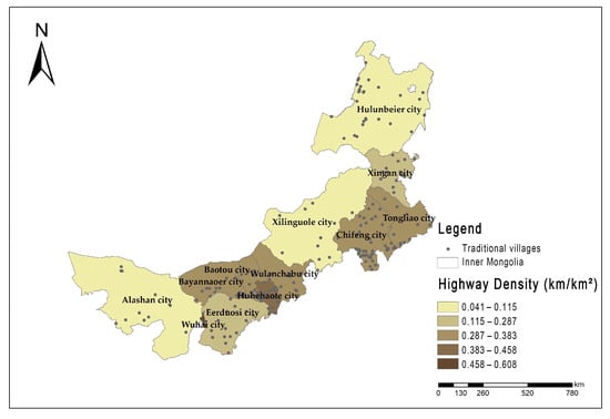 According to Table 2, the eastern area is slightly larger than the western area, and the density of traditional villages is more than four times that of the west. The eastern region contains 68 traditional villages with a density of 1.93/10,000 km2, and the western region contains 11 traditional villages with a density of 0.405/10,000 km2. The area of the central region is slightly smaller than that of the northern region, and the density of traditional villages is more than twice that of the north. The central region contains 83 traditional villages with a density of 3.30/10,000 km2, and the northern region contains 45 traditional villages with a density of 1.46/10,000 km2. It can be seen that the distribution of traditional villages in Inner Mongolia is denser in the middle than in the north and denser in the east than in the west.
