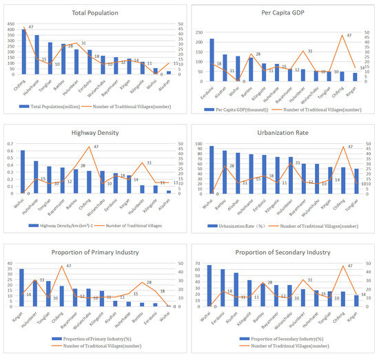 In addition to natural geographical factors, traditional villages are also influenced by economic, population, and social development factors [1,55]. From an economic perspective, the level of economic development in traditional villages has both positive and negative effects [56]. In economically less developed regions, such as Hulunbeier and Chifeng, traditional villages are more widespread. Due to lower economic development and slower urbanization, these areas experience fewer external disturbances, which, although resulting in slower village renovations, also contribute to the preservation of traditional villages. At the same time, economically developed regions like Eerduosi and Baotou also have a higher concentration of traditional villages. These areas have a stronger economic foundation and a higher level of urbanization and industrialization, which can potentially lead to the destruction of the traditional village’s appearance. However, as people’s living standards improve, local governments may have the financial resources and capabilities to protect, repair, and manage traditional villages, to some extent aiding in their continuation. This shows that the protection of traditional villages and economic development are not necessarily contradictory. With economic growth, more specialized funding can be allocated to protect traditional villages, providing better opportunities for their preservation and development.