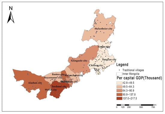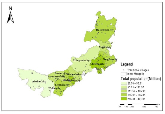 The distribution map of urban area of traditional villages in Inner Mongolia.