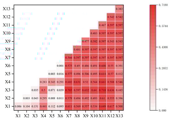 The heat map function in Origin was used to reflect the test results (see Figure 21). The results show that the annual average precipitation ∩ the number of intangible cultural heritage (q = 0.718), the annual average precipitation ∩ the highway density (q = 0.703), the annual average temperature ∩ the number of intangible cultural heritage (q = 0.661), and the elevation ∩ the number of intangible cultural heritage (q = 0.649) are the four groups of interactive factors with the greatest explanatory power. In addition, the q values of the remaining interaction factors are greater than the q values of their single factors, and the detection results can be divided into two-factor enhancement or nonlinear enhancement. It shows that for the spatial distribution of traditional villages in Inner Mongolia, different influencing factors are not only the result of single action but also the result of multiple factors. It is worth noting that the interaction factors with strong explanatory power include annual average precipitation, annual average temperature, and altitude, which proves that the climate and topography of Inner Mongolia have an important impact on the distribution of traditional villages.