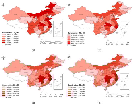 According to the existing literature collection, the distribution characteristics of carbon emissions are analyzed in different countries and regions or different industrial sectors. For example, Yang et al. (2018) observed that the spatial distribution of total carbon emissions in China primarily exhibits a pattern of higher levels in the east and lower levels in the west [8]. Building upon this observation, Liu et al. (2021) identified a specific trend characterized by the central agglomeration in the northeast–southwest direction and spatial divergence in the northeast–southeast direction [9]. Gregg et al. (2009) explored that the characteristics of fossil-fuel-based carbon emissions on a monthly scale have greater temporal and spatial variability than the flux aggregated to the national annual level in North America [10]. At the global level, some scholars have found that there is cross-country convergence in carbon emissions [11], while with the passage of time and economic development, other scholars hold the opposite view [12]. These viewpoints collectively indicate spatial variations in the distribution of carbon emissions. From the perspective of different industrial sectors, the aforementioned studies on carbon emissions have broadly encompassed various sectors, including industry, transportation, and construction [13]. Some scholars have also focused their attention on agriculture, aviation, logistics, and so on [14]. For instance, Zhou et al. (2022) found that the carbon emissions of agriculture are basically characterized by rapid growth in the early stage and gradual stabilization in the later stage [15]. Liu et al. (2019), focusing on local carbon emissions from civil airports, discovered that the emission intensity in the central and eastern regions of China is significantly higher than that in the northeast and western regions [16]. At present, the construction industry is known as a representative industry for its high energy consumption and pollution where the spatial distribution of emission efficiency is unbalanced [17], contributing to regional disparities with an increasing trend of international linkage effects [18]. Meanwhile, some scholars have attempted to explore the variation characteristics of carbon emissions during the operational phase of buildings from a life cycle perspective [19].